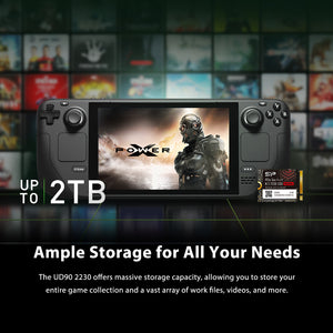 Say goodbye to storage limitations. The UD90 2230 offers a massive storage capacity of up to 2TB, allowing you to store your entire game collection and a vast array of work files, videos, photos, and more. Whether you're embarking on thrilling gaming adventures or managing your professional endeavors, this versatile storage solution ensures that you never miss a beat.